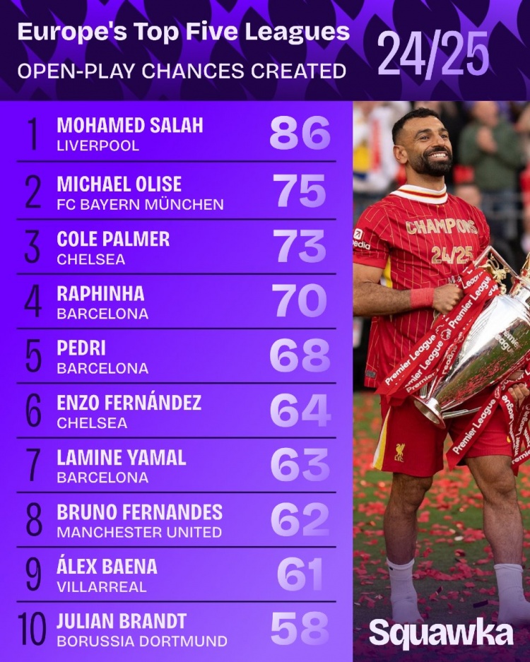 五大联赛运动战创造机会榜:萨拉赫86次居首,奥利塞、帕尔默前三