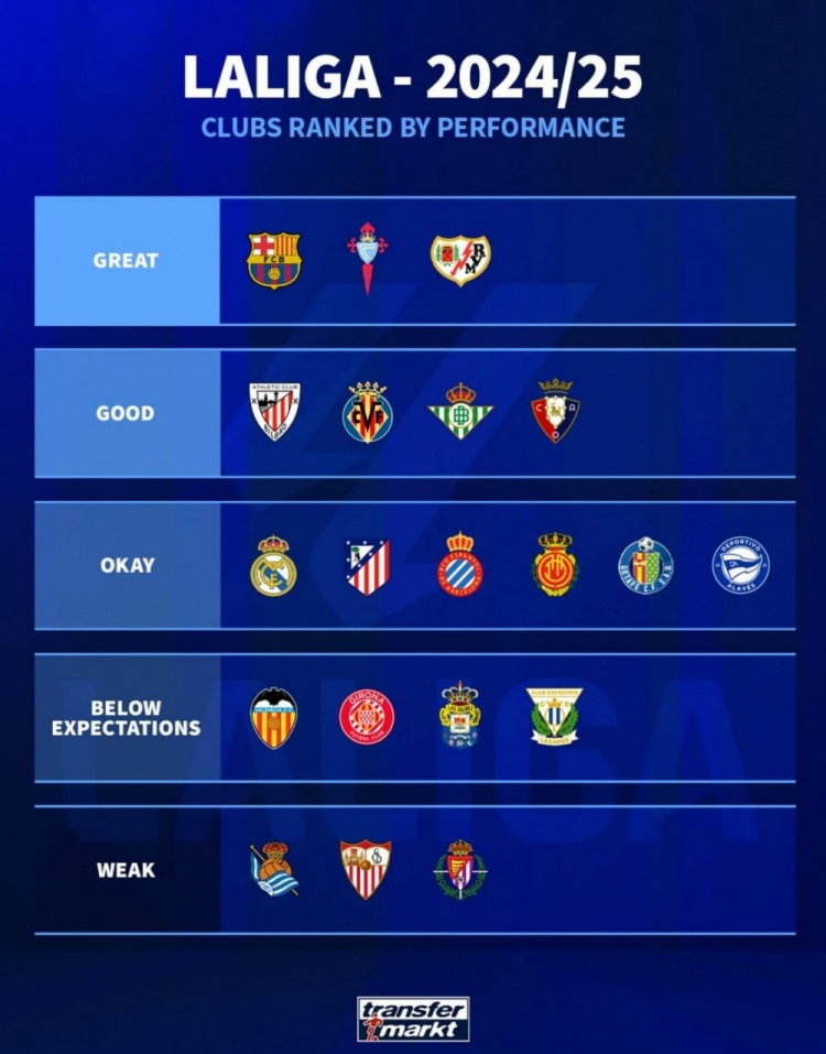 5月29日讯 本赛季西甲战罢,德转也为本赛季西甲球队表现做出评级,具体如下:出色:巴萨、塞尔塔、巴列卡诺良好:毕尔巴鄂竞...