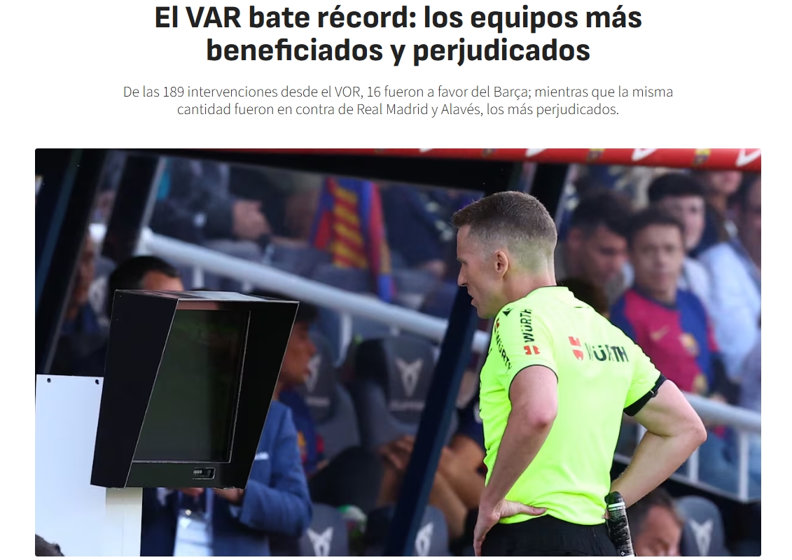 阿斯:本赛季西甲VAR有利判罚巴萨16次最多 不利判罚皇马16次最多