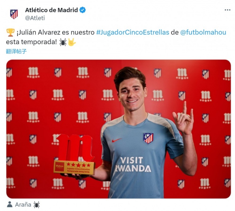 29球7助!阿尔瓦雷斯领取马竞赛季最佳球员奖杯