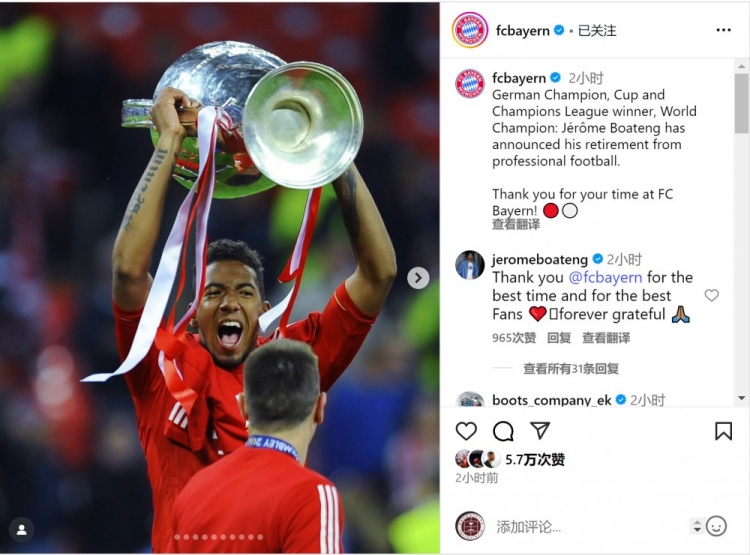 博阿滕宣布退役⚽拜仁社媒晒照致敬:感谢你在拜仁的时光