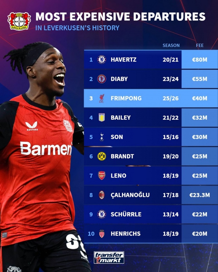 药厂出售球员转会费:哈弗茨8000万欧最高,弗林蓬第3&孙兴慜第5