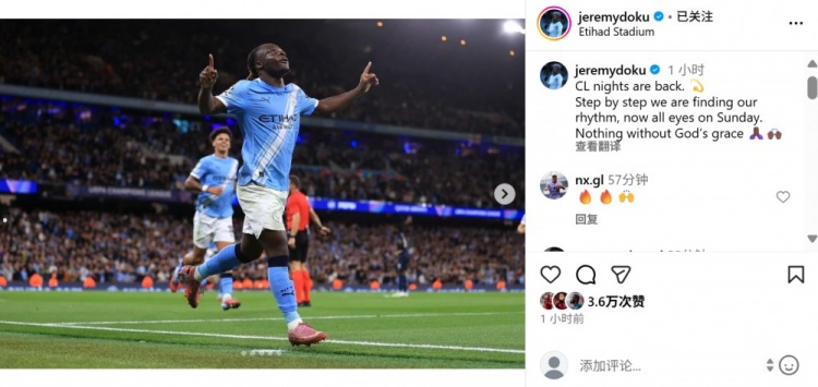 9月19日讯 在本轮欧冠,曼城2-0击败那不勒斯。本场比赛多库打进精彩进球,他也在个人社媒晒出庆祝进球照片,配文写道:“...