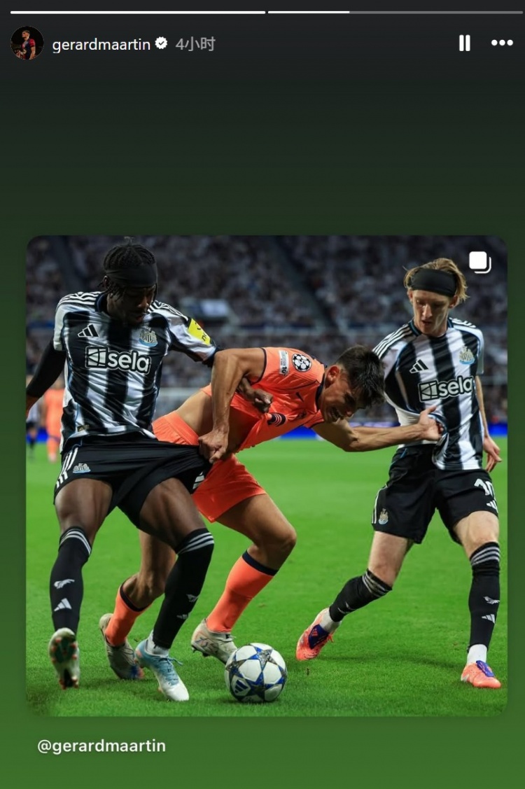 9月19日讯 在本轮欧冠,巴萨2-1击败纽卡。本场比赛巴萨球员马丁首发出战,他也在个人社媒晒出本场与戈登、伊兰加两名纽卡...