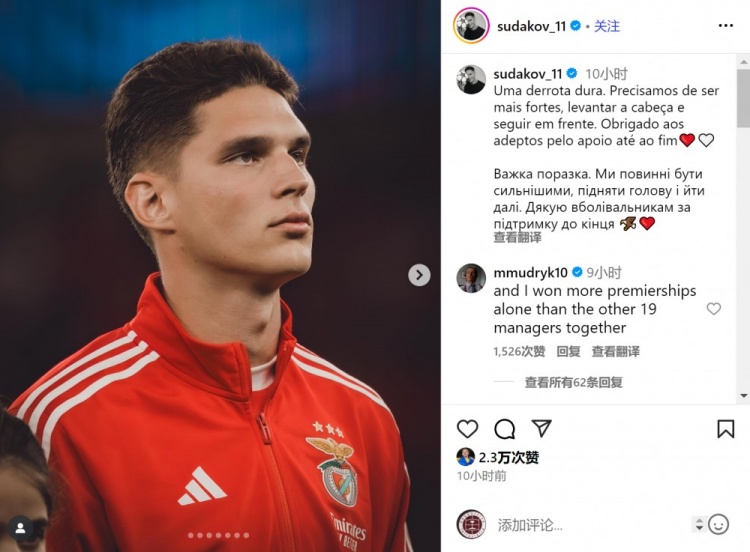9月19日讯 欧冠联赛阶段首轮比赛,本菲卡主场2-3不敌卡拉巴赫。效力于本菲卡的乌克兰中场苏达科夫赛后在ins上写道:“...
