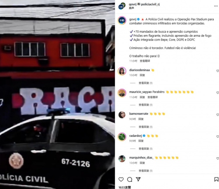 法媒:里约警方打击极端球迷组织,1人死亡2人被捕并缴获枪支弹药