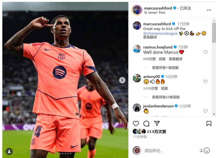 9月19日讯 欧冠联赛阶段首轮比赛,巴萨客场2-1击败纽卡。此役拉什福德为巴萨梅开二度,赛后他在社交媒体上晒出庆祝进球的...