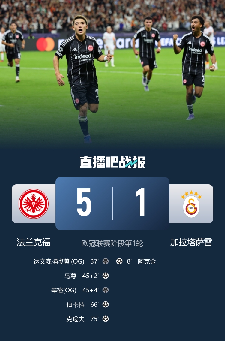 法兰克福5-1逆转加拉塔萨雷 伯卡特传射乌尊破门堂安律造乌龙