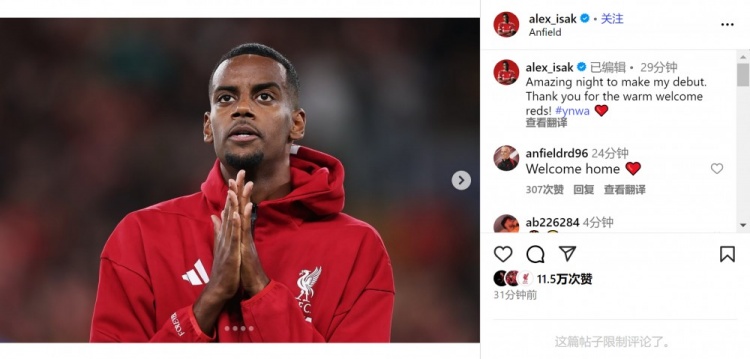 伊萨克社媒:在美妙的夜晚迎来首秀,感谢红军球迷的热情欢迎