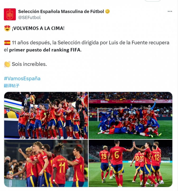 世界第一!西班牙队社媒:我们时隔11年重回FIFA排名首位