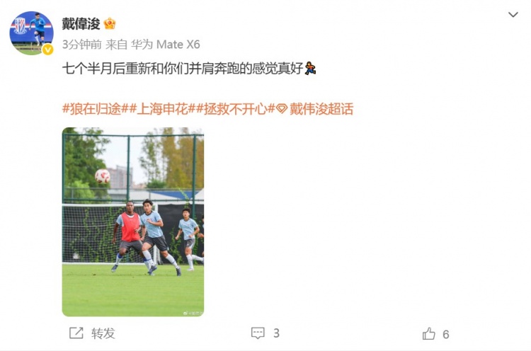 9月18日讯 申花球员戴伟浚更新社媒,晒出参加球队合练的照片。在赛季前上海申花vs天津津门虎的热身赛中,申花中场戴伟浚遭...