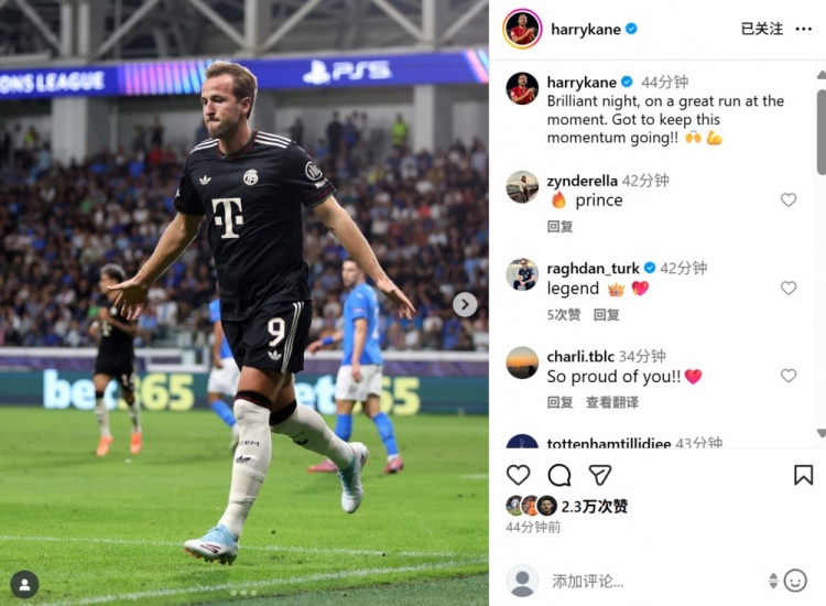梅开二度,凯恩社媒晒庆祝照:精彩的夜晚,让我们把势头延续下去