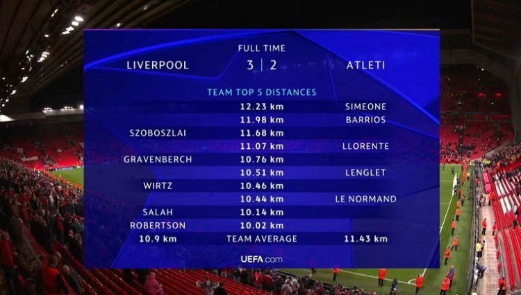 利物浦vs马竞跑动距离:小西蒙尼12.23km最多,红军队内索博居首