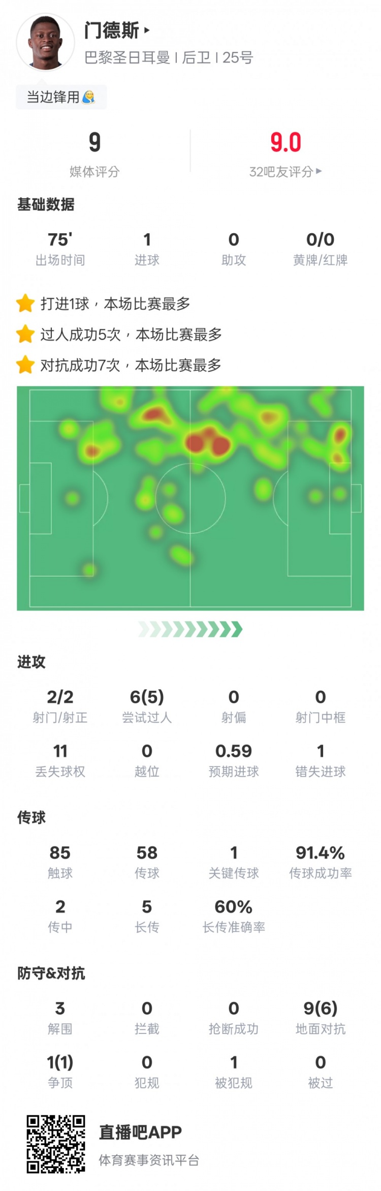 门德斯本场比赛数据:1进球5过人成功1关键传球,评分9.0