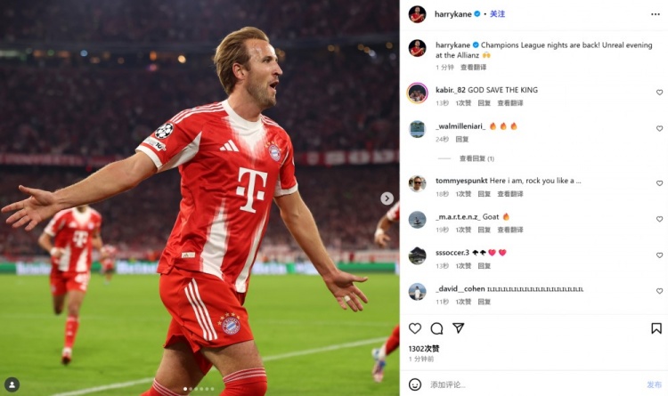 凯恩社媒晒照庆祝胜利:欧冠之夜归来!在安联球场的非凡一晚