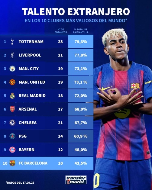 9月18日讯 德国转会市场统计了身价排名前十俱乐部的外籍球员占比,并列出榜单,在身价前十俱乐部之中,热刺外援占比79.3...