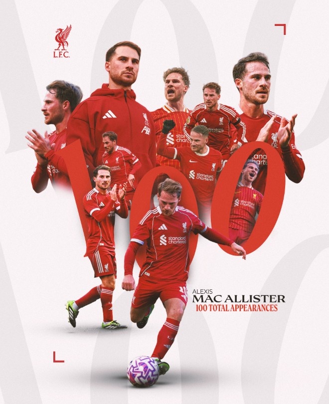 替补登场,麦卡利斯特迎利物浦生涯百场里程碑之战