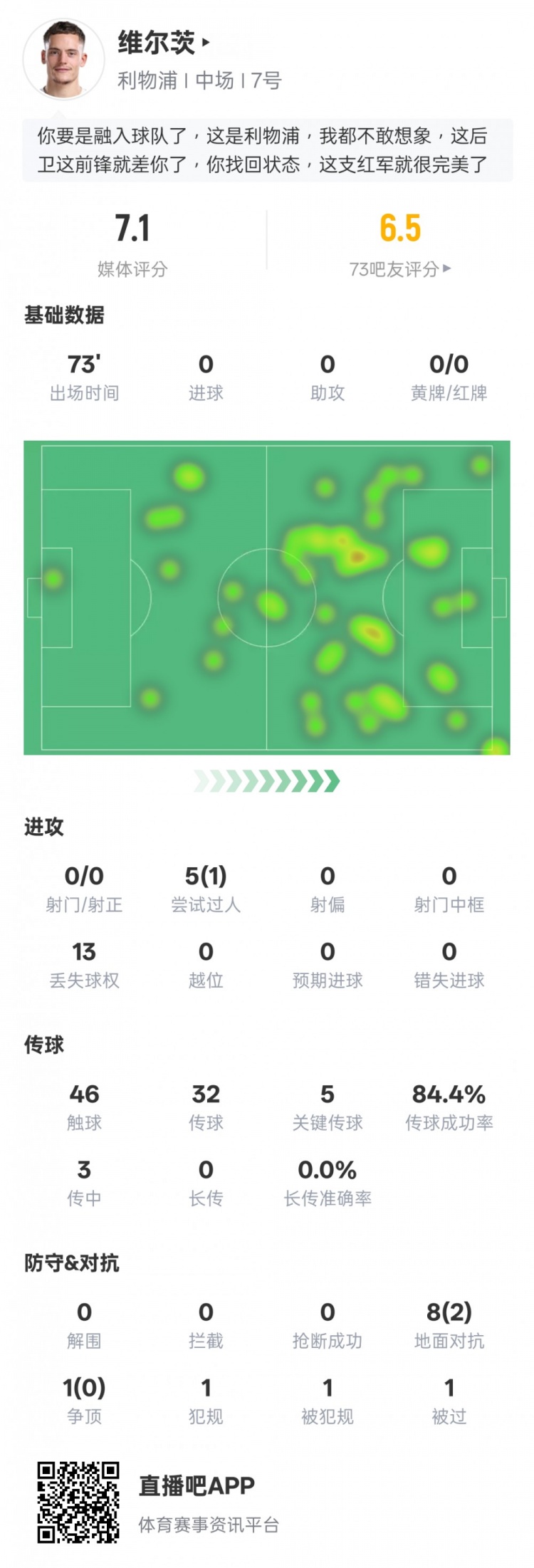 维尔茨本场数据:5关键传球1过人成功13次丢失球权,评分7.1