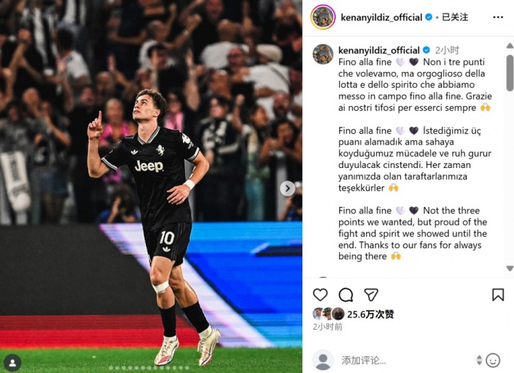9月17日讯 在欧冠首轮比赛,尤文4-4战平多特。本场比赛伊尔迪兹再度打进精彩远射,他也在社媒发文写道:“直到最后!没有...