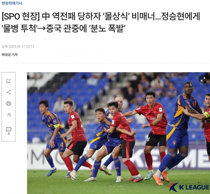韩媒赛后声称:蓉城球迷朝蔚山球员扔水瓶,展现中国球迷不文明