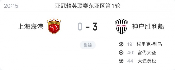 开门黑×3!海港主场0-3神户胜利船 中超球队亚冠精英赛首轮全败