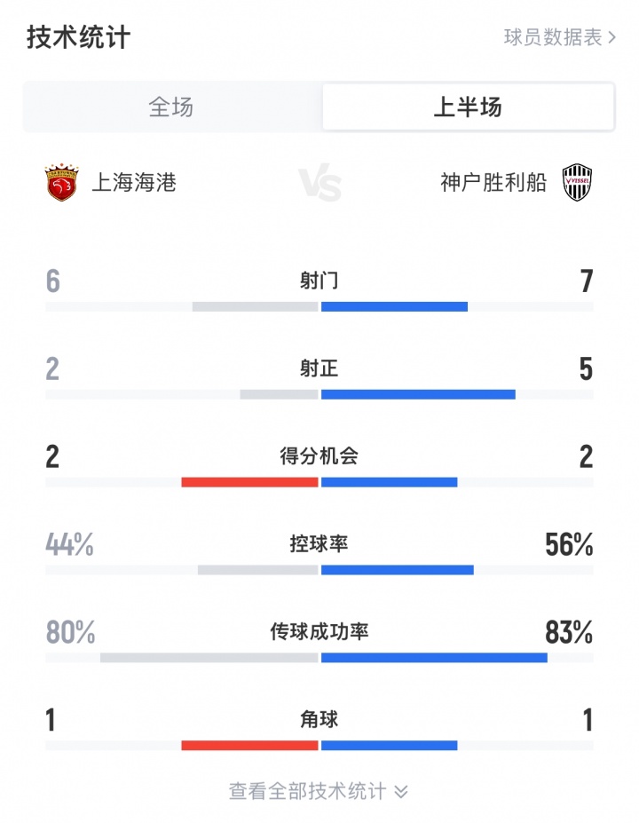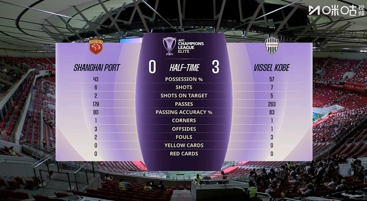 半场数据:神户7次射门5次射正进3球,海港6射2正错失2次得分机会