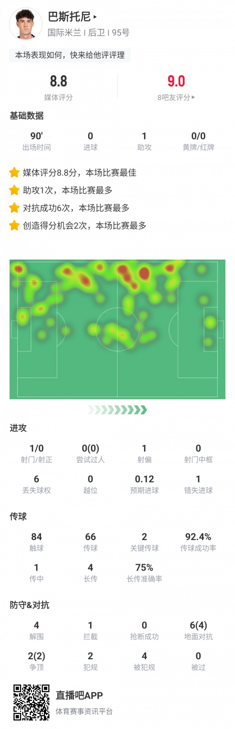 巴斯托尼本场数据:助攻1次、创造2次得分机会、评分高达8.8分