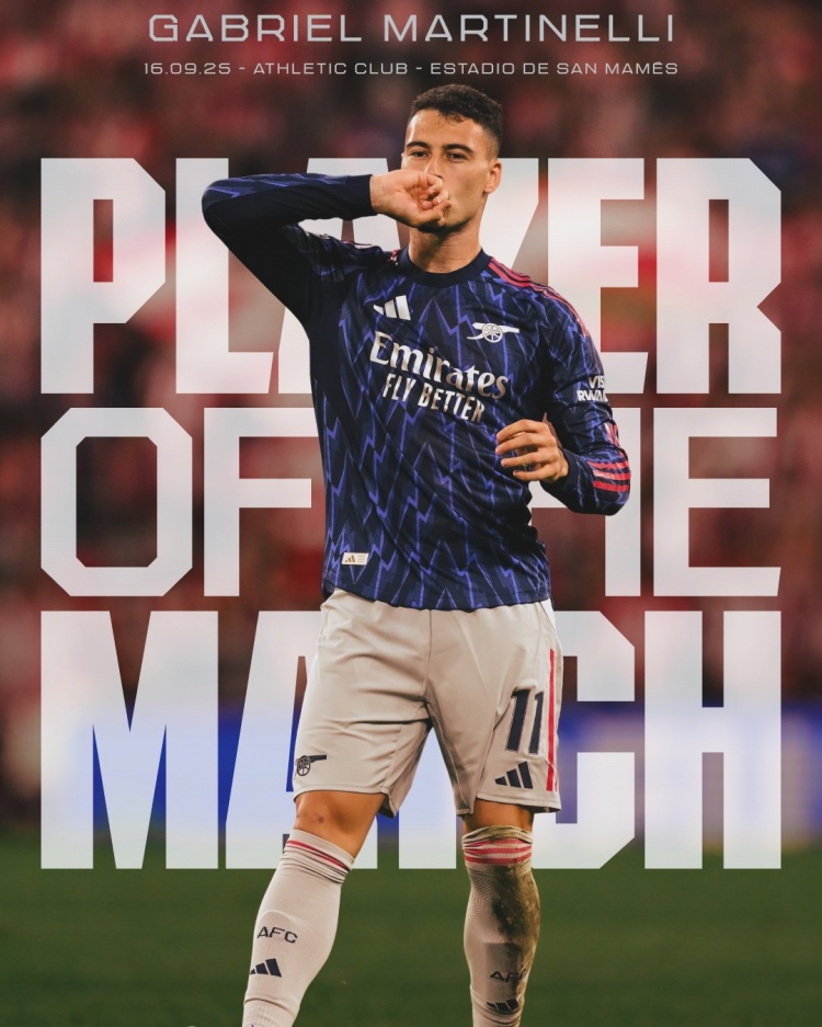 替补出场1射1传!马丁内利当选阿森纳vs毕巴全场最佳球员