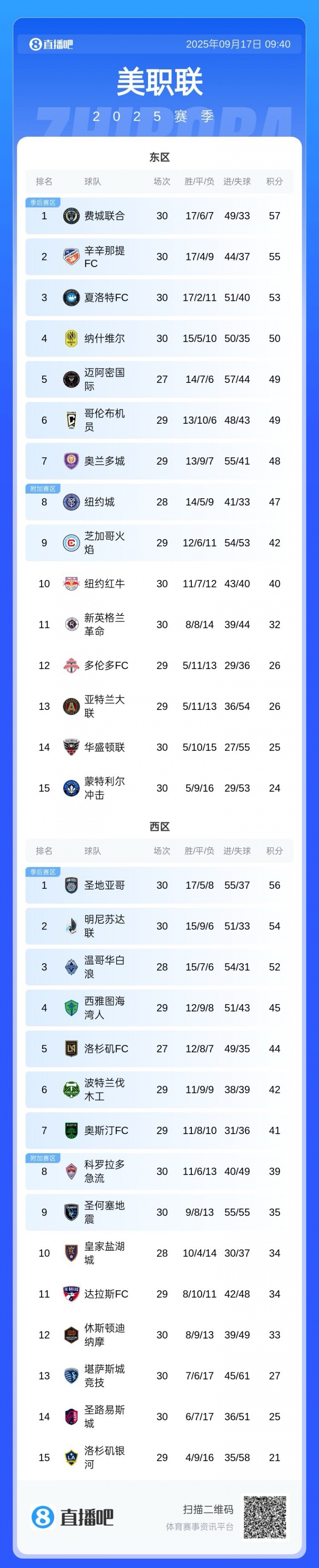 美职联最新积分榜:迈阿密少赛3场,从东区第8升至第5!