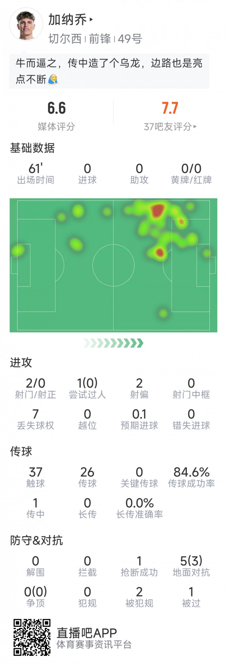 10月1日讯 在本轮欧冠切尔西对阵本菲卡的比赛中,加纳乔制造乌龙,以下为他在本场数据:比赛时间61分钟2射0正37次触球...