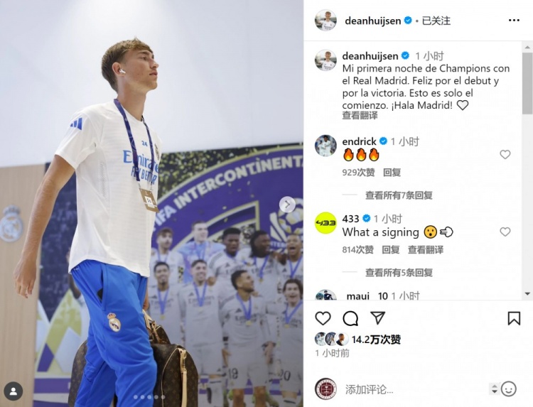 踢满全场!赫伊森社媒:我在皇马的首个欧冠之夜,这只是开始