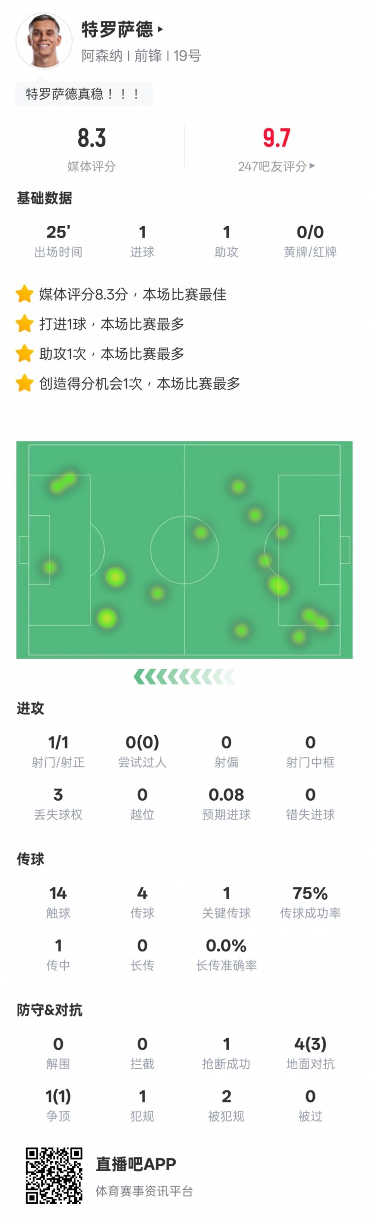 特罗萨德本场数据:传射建功+1关键传球,评分8.3全场最高