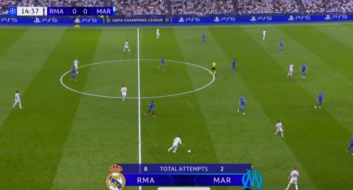 按着打!比赛皇马vs马赛仅过15分钟,皇马已射门8脚