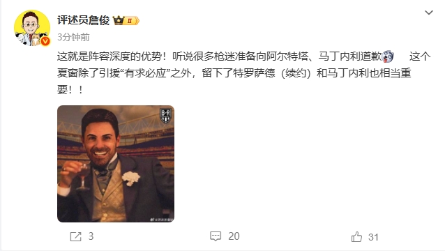 詹俊:这就是阵容深度!听说很多枪迷准备向塔帅、小马丁道歉