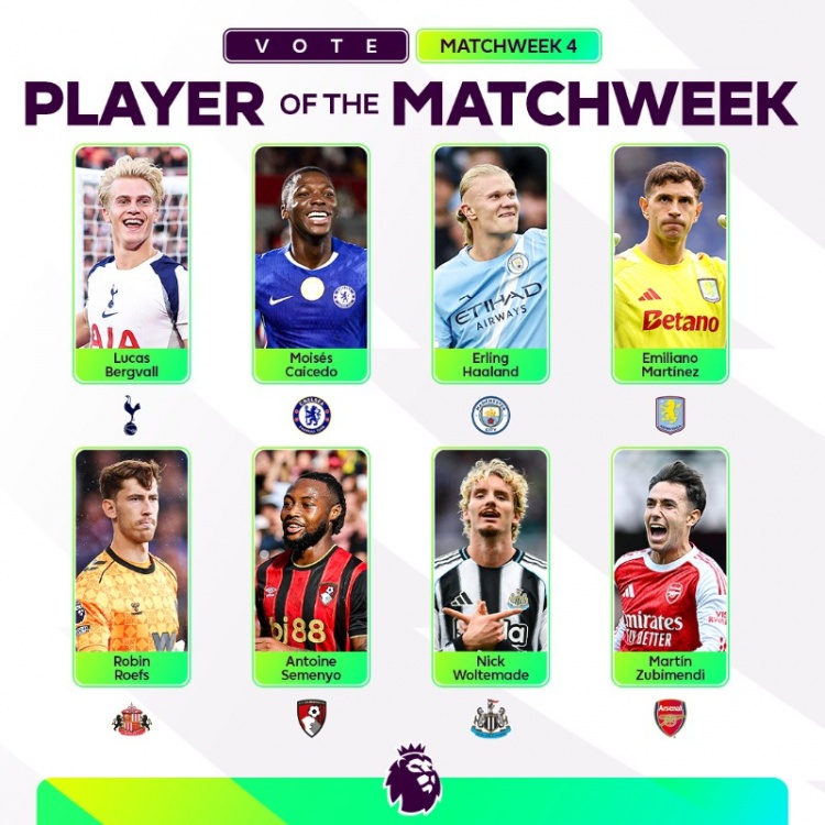 9月16日讯 英超第4轮战罢,联赛官方列本轮最佳球员候选,哈兰德、沃尔特马德、凯塞多、苏维门迪在列。英超第4轮最佳球员候...