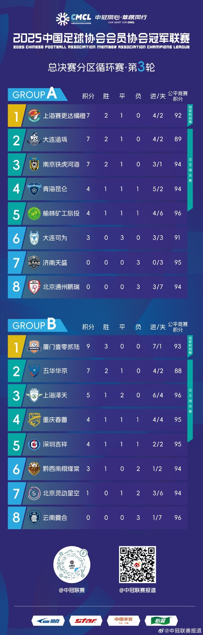 9月15日讯 中冠总决赛分区循环赛第三轮战罢,上海赛更达橘橙以进球数和公平竞赛积分优势领跑A组,厦门壹零贰陆3战全胜领跑...