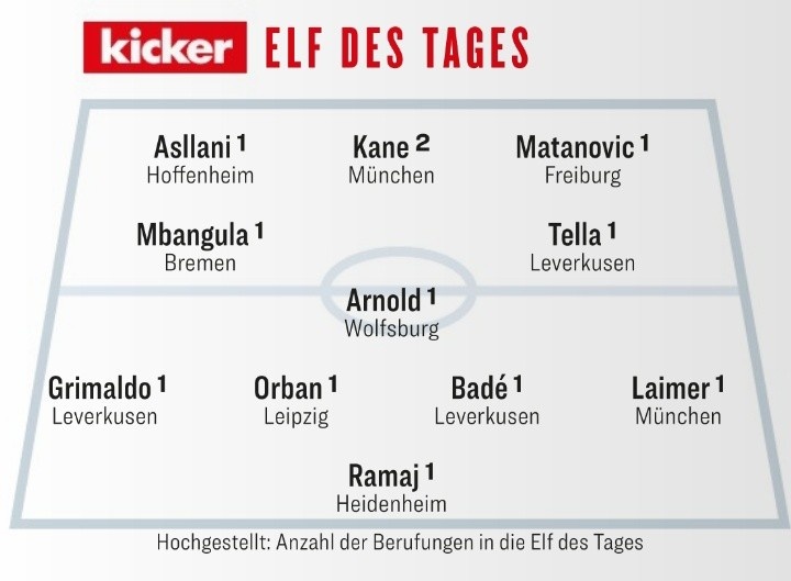踢球者本轮德甲最佳阵:凯恩领衔,格里马尔多、莱默尔入选
