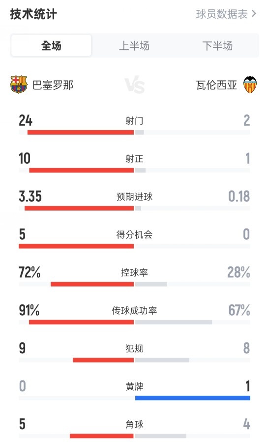 全面碾压!巴萨6-0瓦伦西亚:射门24-2,射正10-1,控球率72%-28%