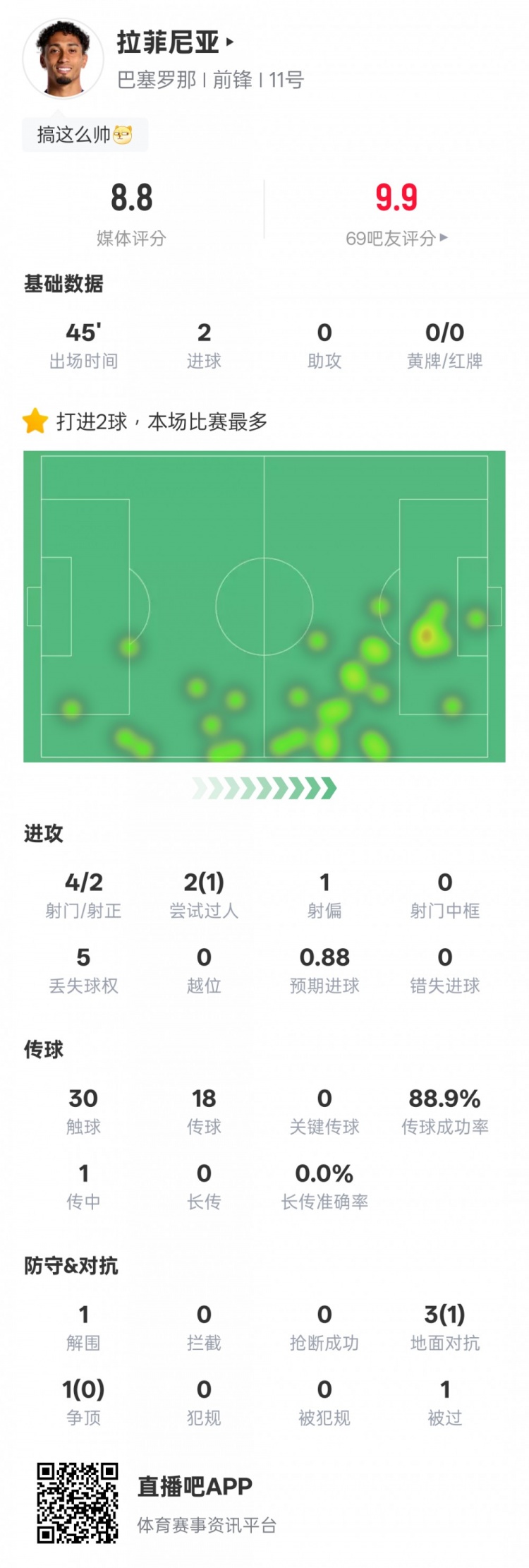 拉菲尼亚本场比赛数据:2射正2进球1过人成功,评分8.8