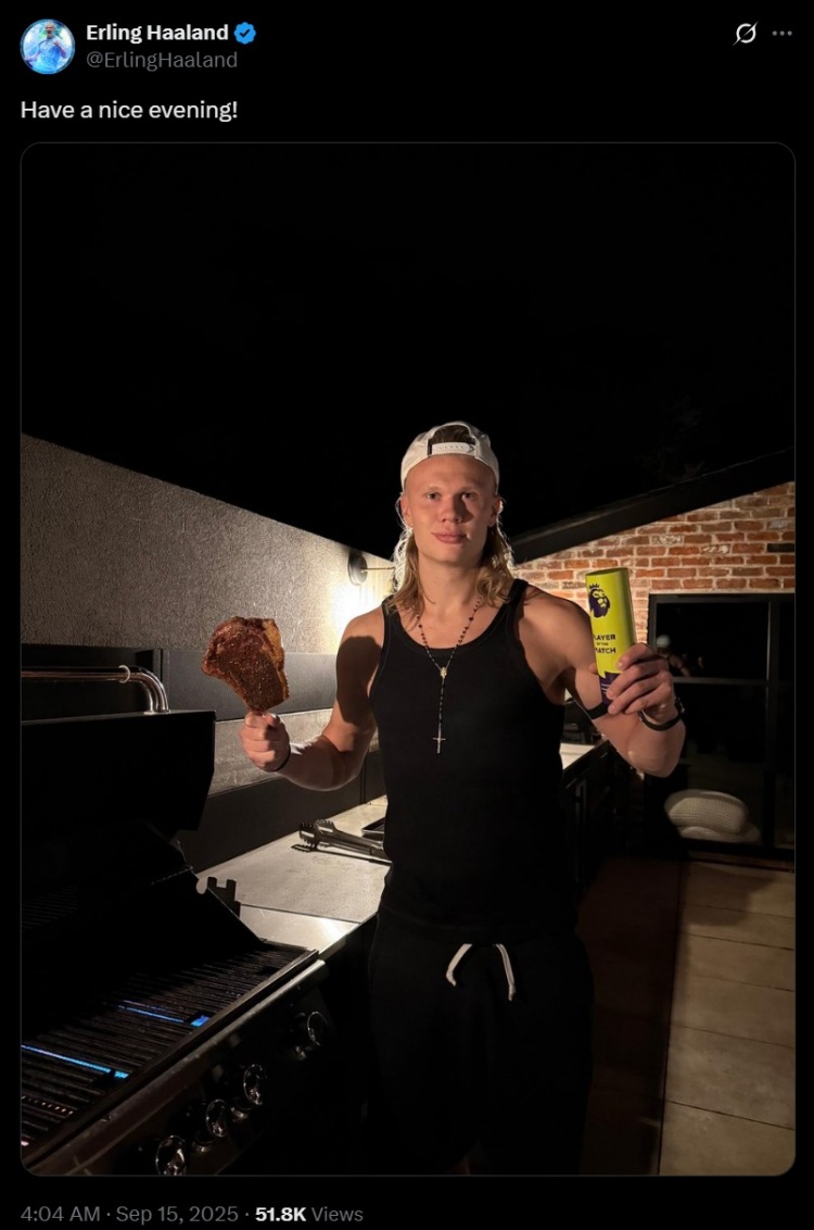 9月15日讯 英超第4轮曼市德比,曼城主场3-0击败曼联,哈兰德梅开二度。赛后这名前锋更新社媒,一身休闲装扮,手拿烤肉与...