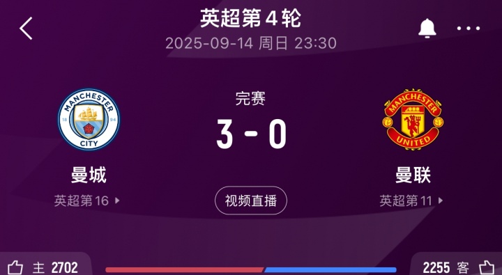 09月15日讯 曼市德比战,曼联0-3不敌曼城,BBC报道,比赛尾声阶段,曼城球迷在对阿莫林高唱着“早上就下课”。...