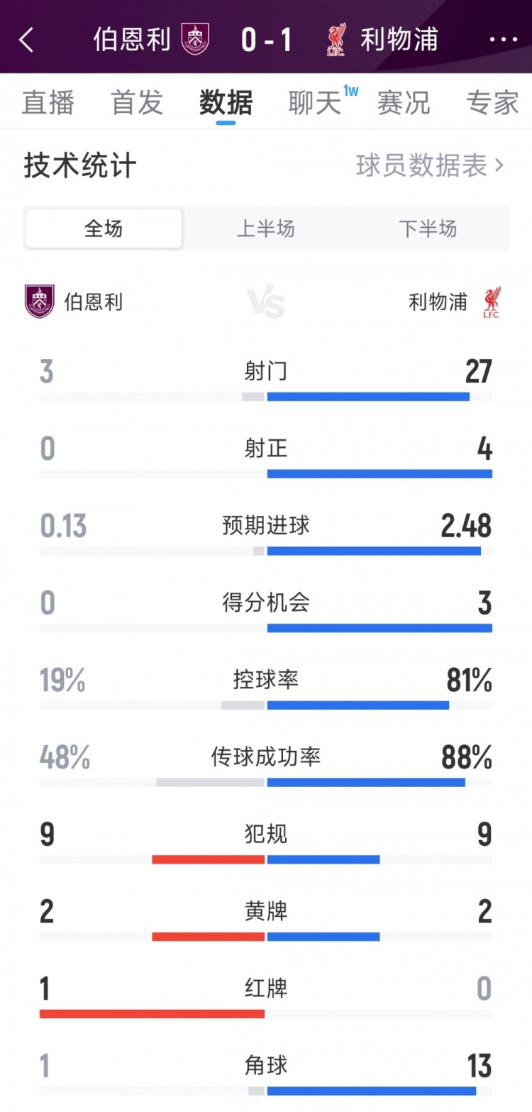 利物浦1-0伯恩利全场数据:射门27-3,射正4-0,红军控球率超8成