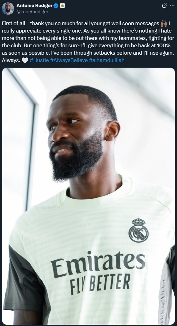 吕迪格感谢球迷关心:我将竭尽所能以最快速度回归最佳状态