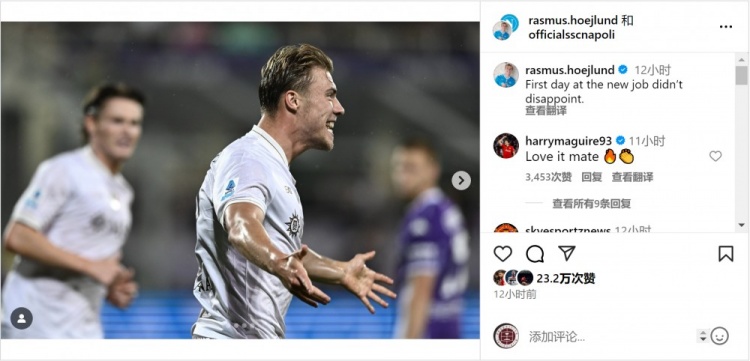 霍伊伦那不勒斯首秀破门,马奎尔留言鼓励:太棒了兄弟🔥👏