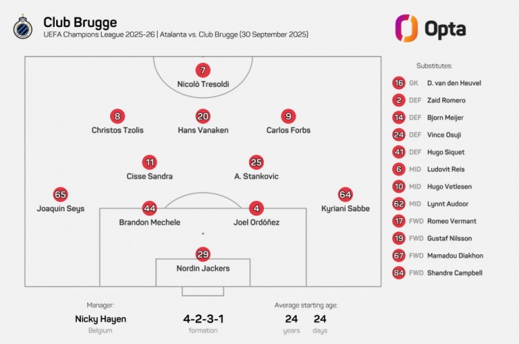 24岁24天!布鲁日排出欧冠历史平均年龄最年轻首发阵容