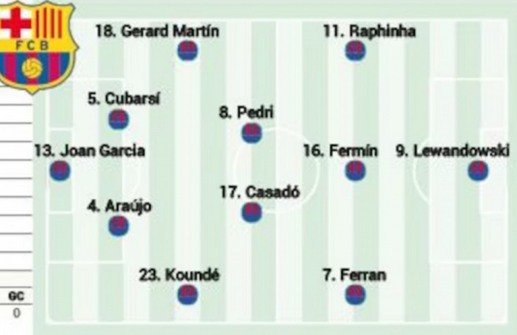 阿斯预测巴萨首发:莱万、拉菲尼亚、费兰三叉戟,卡萨多在列