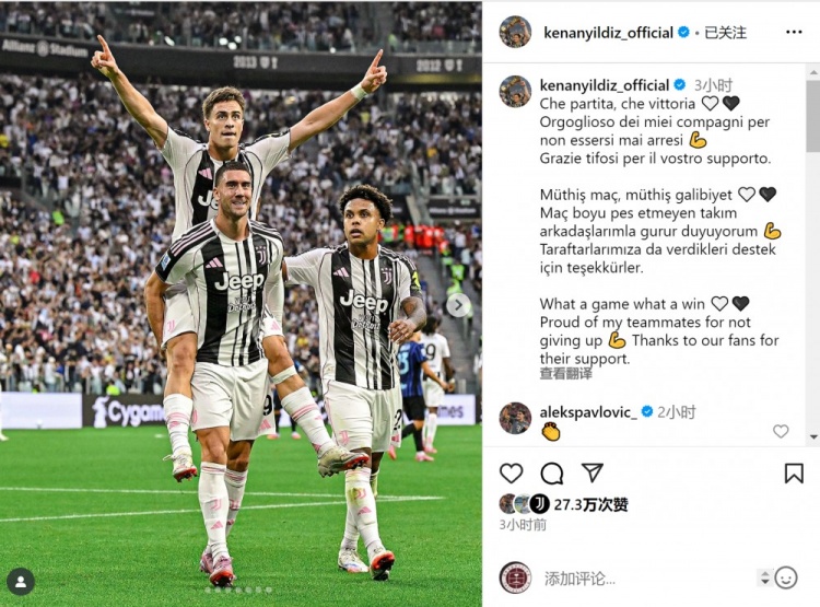 9月14日讯 意甲第三轮比赛,伊尔迪兹传射建功,帮助尤文主场4-3击败国米,他当选全场最佳球员。伊尔迪兹社媒晒出弗拉霍维...