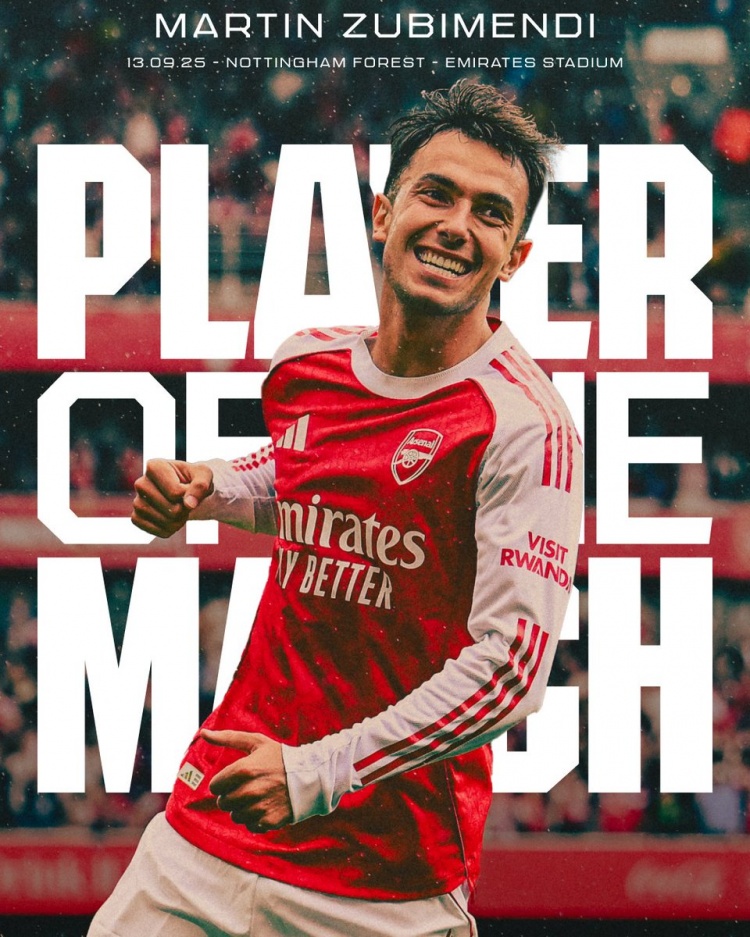 阿森纳官方:苏维门迪当选3-0诺丁汉森林的球迷票选队内最佳球员