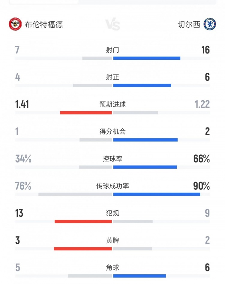 布伦特福德vs切尔西数据:射门7比16、射正4比6、控球率34%比66%