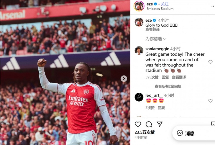 代表阿森纳首次首发+送助攻!埃泽社媒庆祝:荣耀归于上帝
